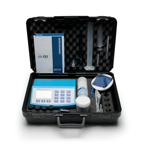 HI83300 se suministra con cubetas y tapas de muestra (4 cada una), paño para limpiar cubetas, conector de cable USB a micro USB, adaptador de corriente y manual de instrucciones. Los reactivos no están incluidos.