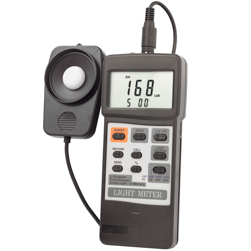• El medidor de pantalla dual mide lux en tres rangos: 0 a 1999 (resolución de 1 lux), 2000 a 19 990 (resolución de 10 lux) y 20 000 a 50 000 (resolución de 100 lux).