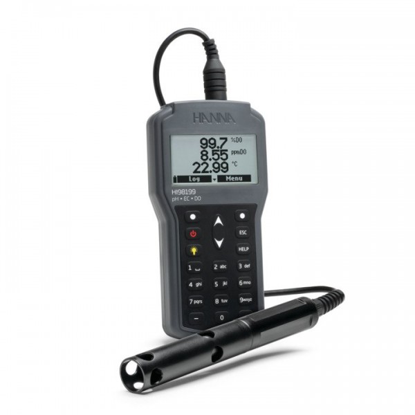 Este medidor HI98199 es un equipo versatil que puede medir, pH, Conductividad u Oxígeno disuelto.