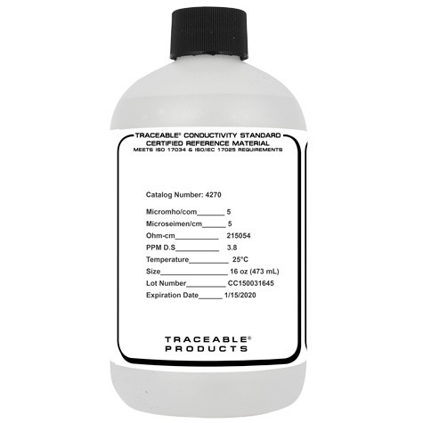 - Cada botella está etiquetada para calibrar la conductividad (microsiemens/micromhos), la resistividad (ohmios) y los sólidos disueltos (partes por millón).