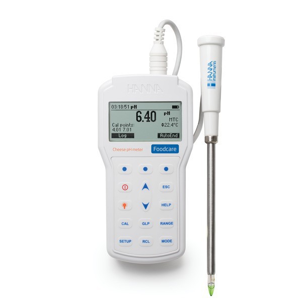 • Es un medidor de pH portátil, robusto, resistente al agua que mide el pH y la temperatura utilizando el electrodo de pH F2423, específico para medir en queso. Este medidor profesional e impermeable cumple con los estándares IP67.
