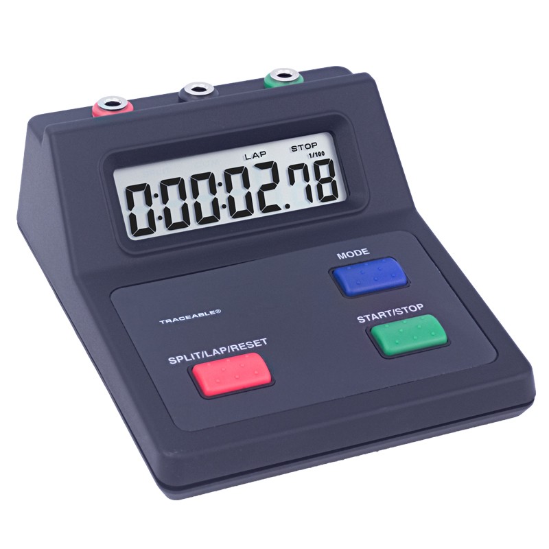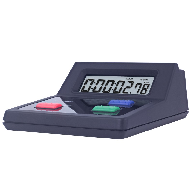 - Veces de 0,01 segundo a 9 horas, 59 minutos, 59 segundos y 99 centésimas de segundo. Conmutable entre acumulativo y dividido por intervalos, la unidad también permite un número infinito de tiempos de espera. Las teclas de gran tamaño facilitan su uso.