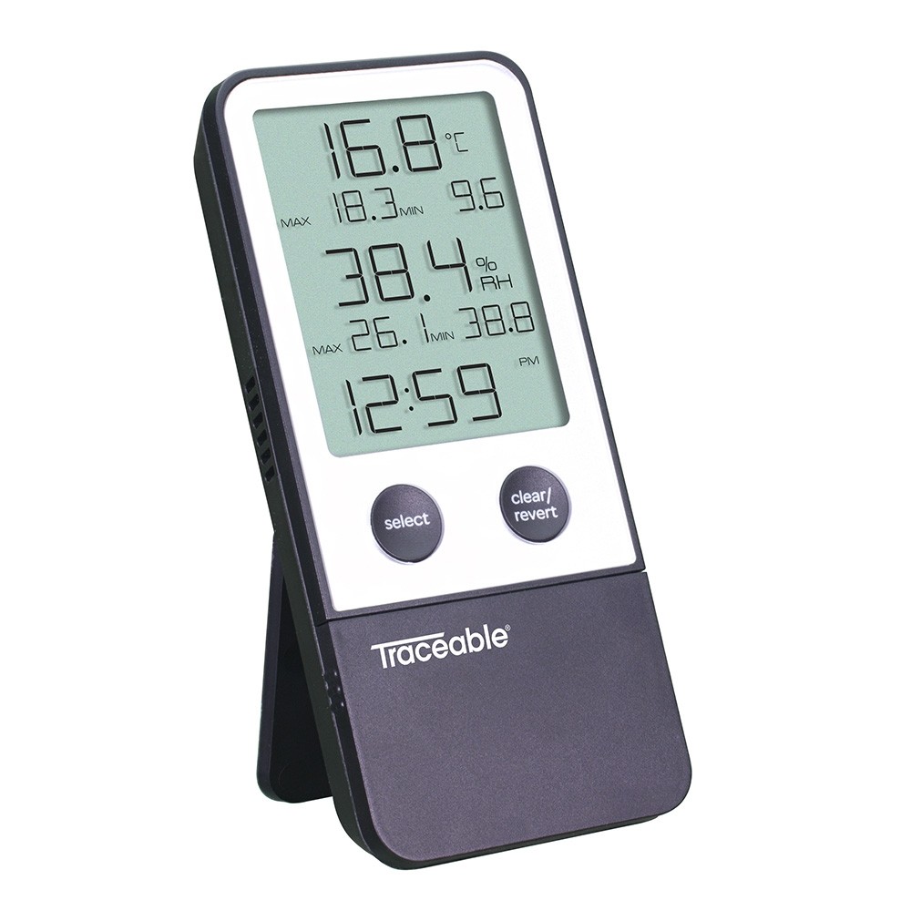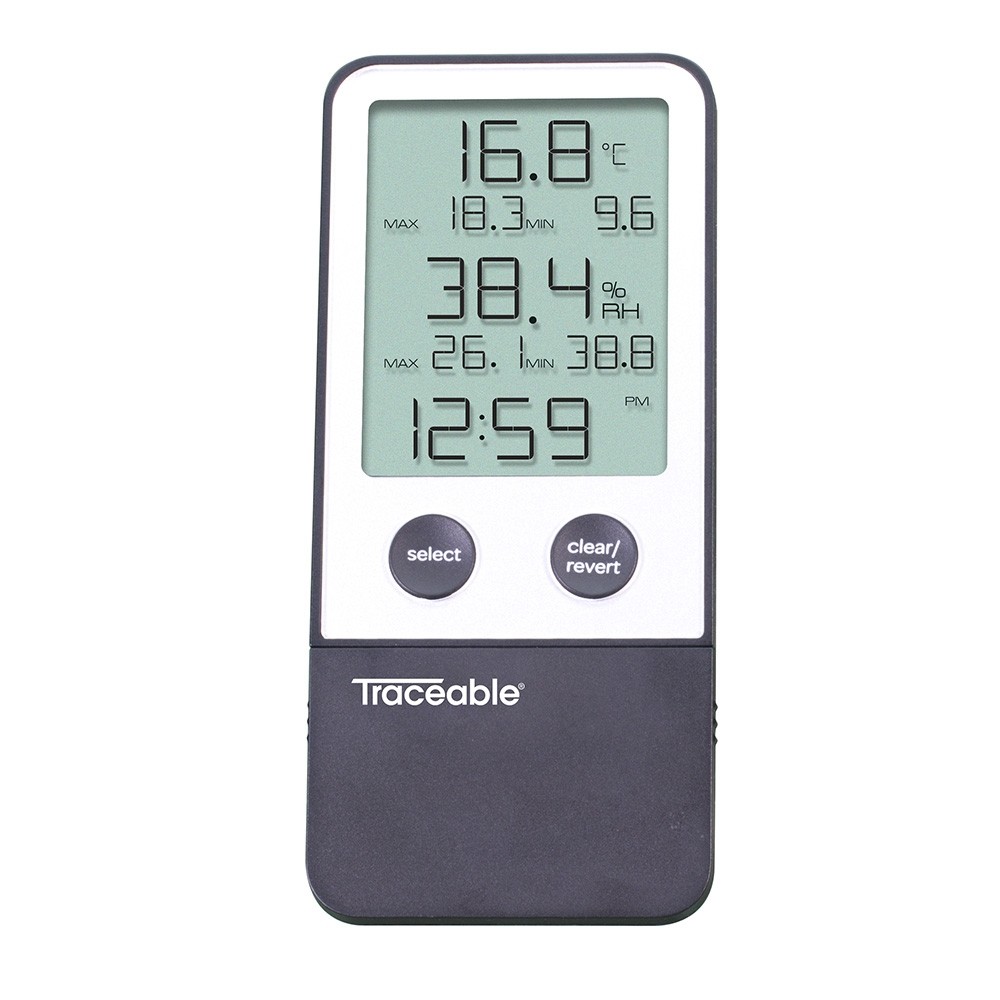 Higrómetro, cinta autoadherente, pilas AAA, imán recordatorio de recalibración, guía de inicio rápido y certificado Traceable® |