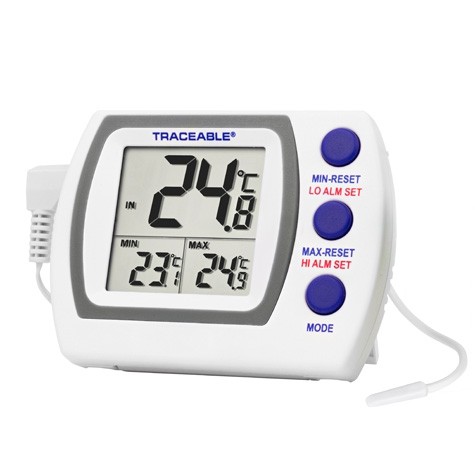 - La alarma es programable en incrementos de 1° y alerta al usuario cuando la temperatura sube por encima o cae por debajo de un punto establecido.