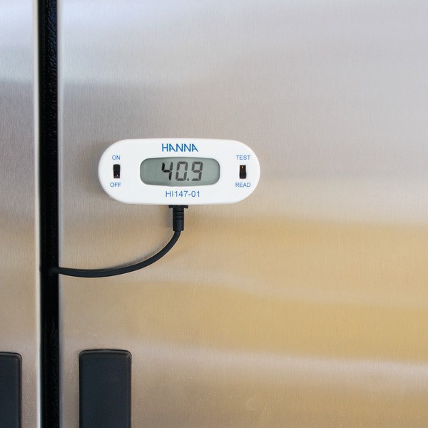 - Estos termómetros están especialmente diseñados con un cable de silicona compatible con alimentos, y puede ser usado para un control continuo de la temperatura en áreas de cuidado de alimentos. Simplemente conecta el medidor al exterior de un frigorífico o cabina metálica. Esto es posible gracias a los dos imanes situados en la parte trasera de la unidad. La sonda puede entones ser insertada dentro del frigorífico o armario para un control de temperatura continuo. Un selector permite un chequeo rápido de la calibración del medidor en cualquier momento.