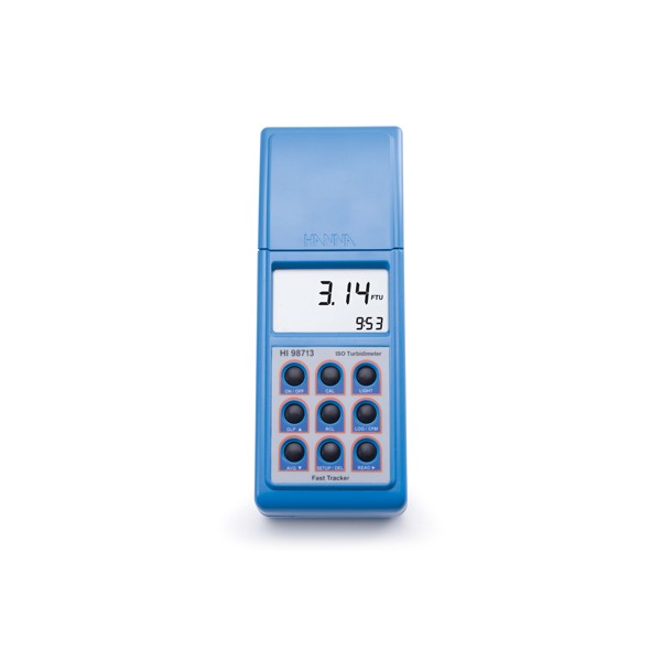 - Diseñado para mediciones de agua con turbidez baja, el turbidímetro HI98713 mide la turbidez de una muestra en el rango de 0,00 a 1000 FNU. Un efectivo algoritmo calcula y convierte la salida de los detectores en FNU. Dependiendo de la precisión requerida, se puede seleccionar medición normal, continua, o media de valores.