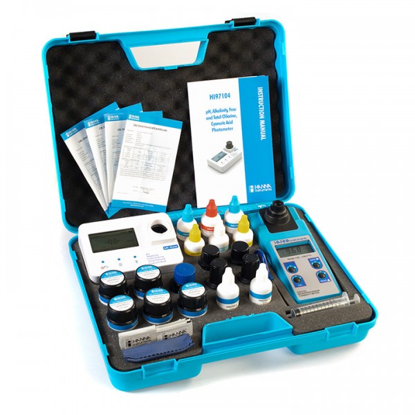 – El maletín HS94101C se suministra con turbidímetro portátil (0,00 a 1000 FTU) (HI93703), 2 cubetas de medición con tapa, patrones de calibración de 0 y 10 NTU (30ml) y fotómetro multiparamétrico portátil (Cloro Libre y Total/Bromo/pH/Ácido Cianúrico/Hierro/Iodo) (HI97101C), cubetas de medición con tapa, reactivo líquido para 100 test de Cloro Libre, 100 test de Cloro Total, 100 test de pH, 10 de bromo y 10 de Ácido Cianúrico, paño limpieza, cubetas, tijeras, pilas e instrucciones y además, incluye patrones de calibración.