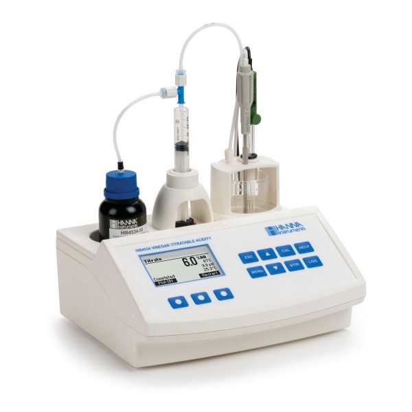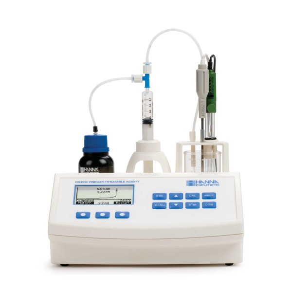 - El HI84534 es un minivalorador automático y pHmetro fácil de usar, diseñado para el análisis rápido y preciso de la acidez total y pH en vinagre que analiza mediante reacción ácido-base la muestra mostrando el resultado como ácido acético. Es la herramienta perfecta para análisis en vinagre debido a su capacidad para eliminar factores subjetivos que incluyen indicadores de color, errores en los cálculos matemáticos o adiciones erráticas de valoradores.