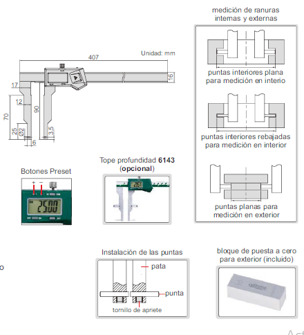 - Botones: on/off, set, mm/inch, ABS, preset (+, -).